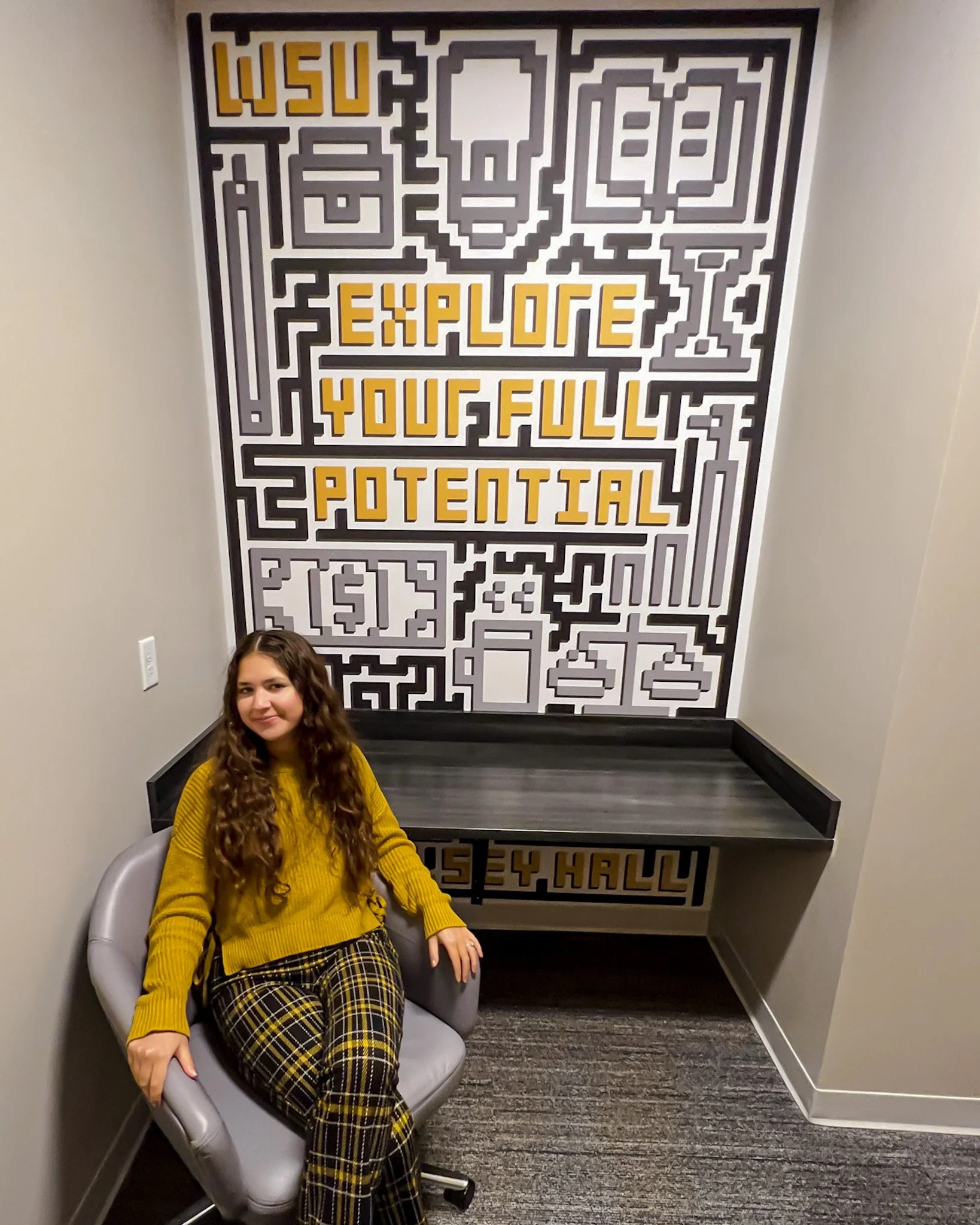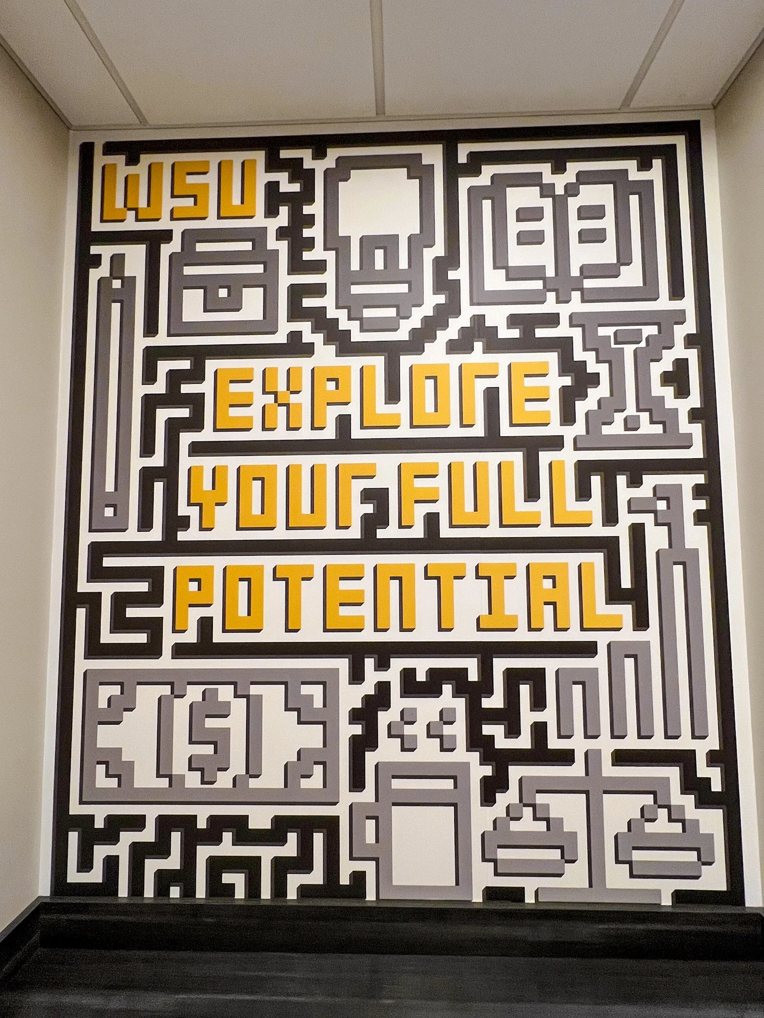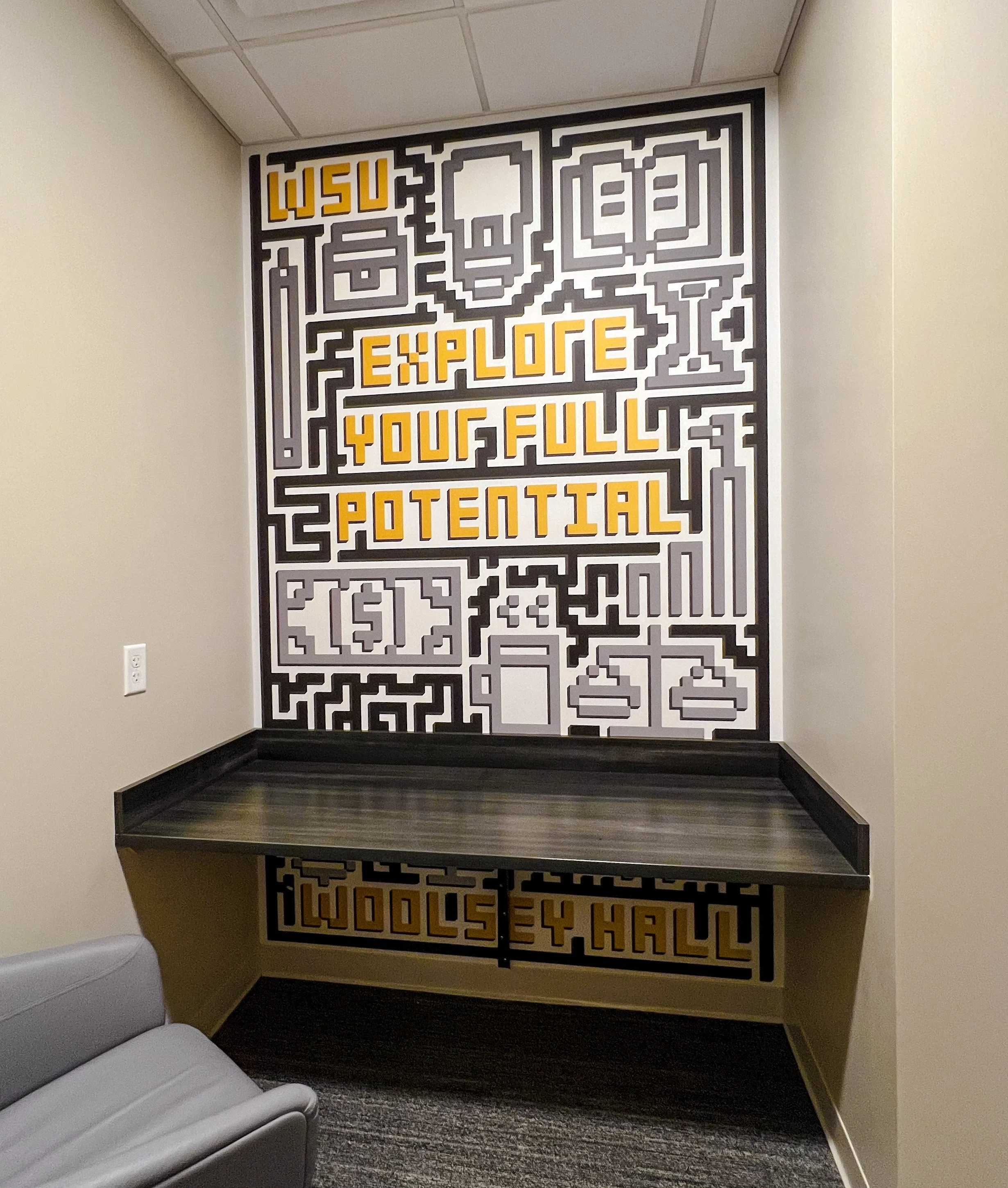 The design for Woolsey Hallβs quiet space showcases a bitmap maze including icons and words relevant to Wichita Stateβs business school. Itβs a fun and engaging way for students to interact with the spaceβor maybe even give them a brain break from whatever they are studying.