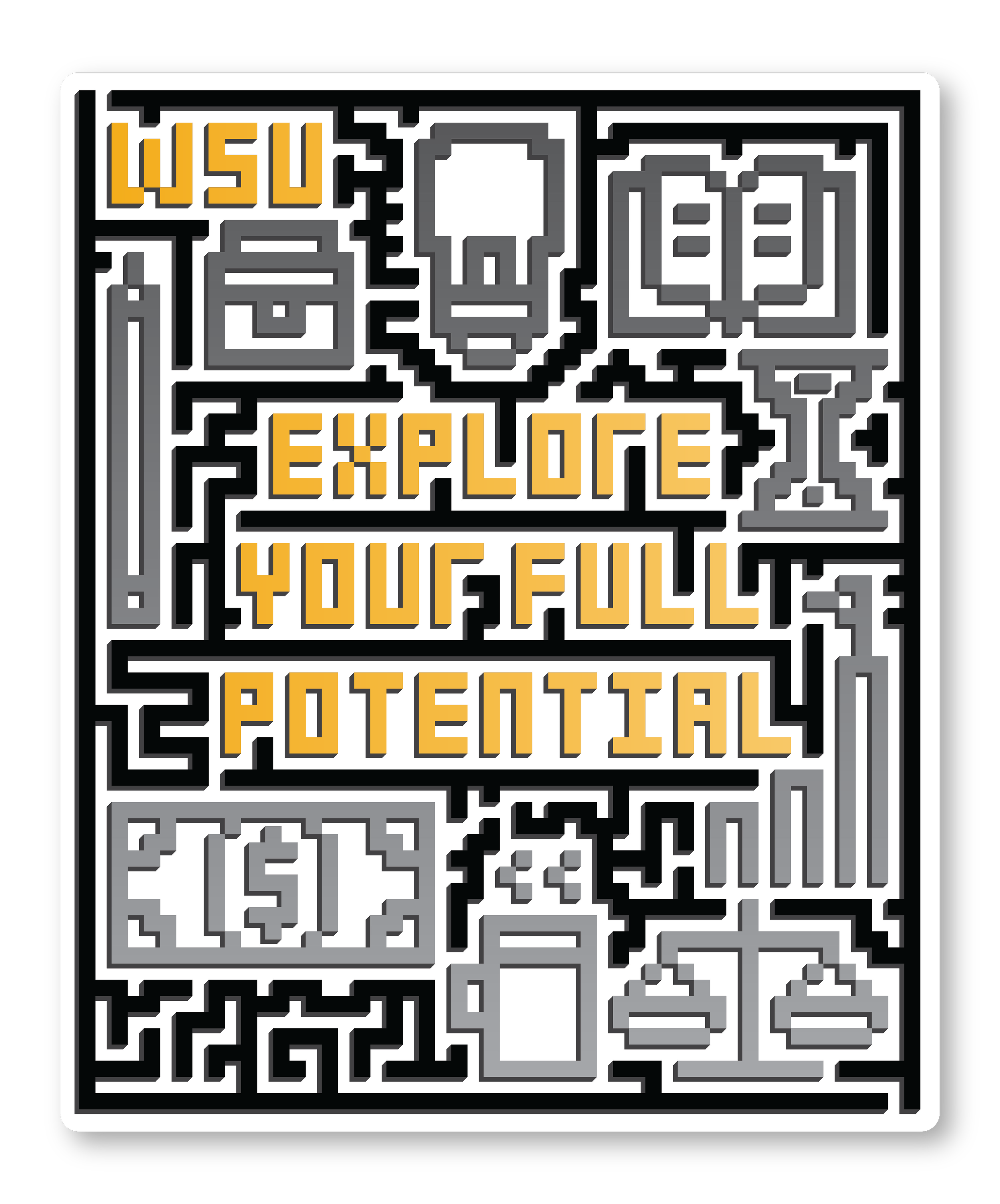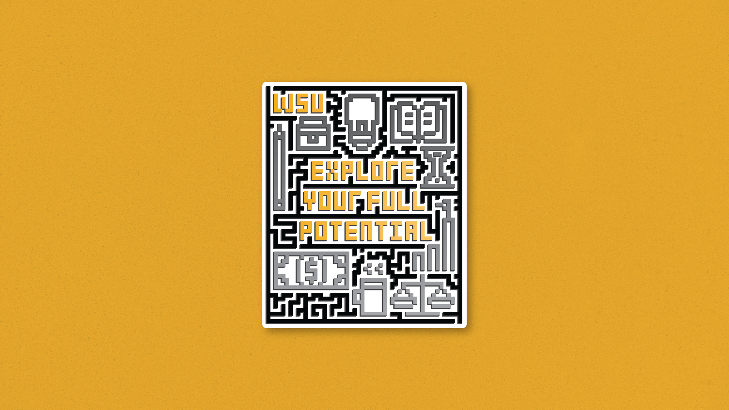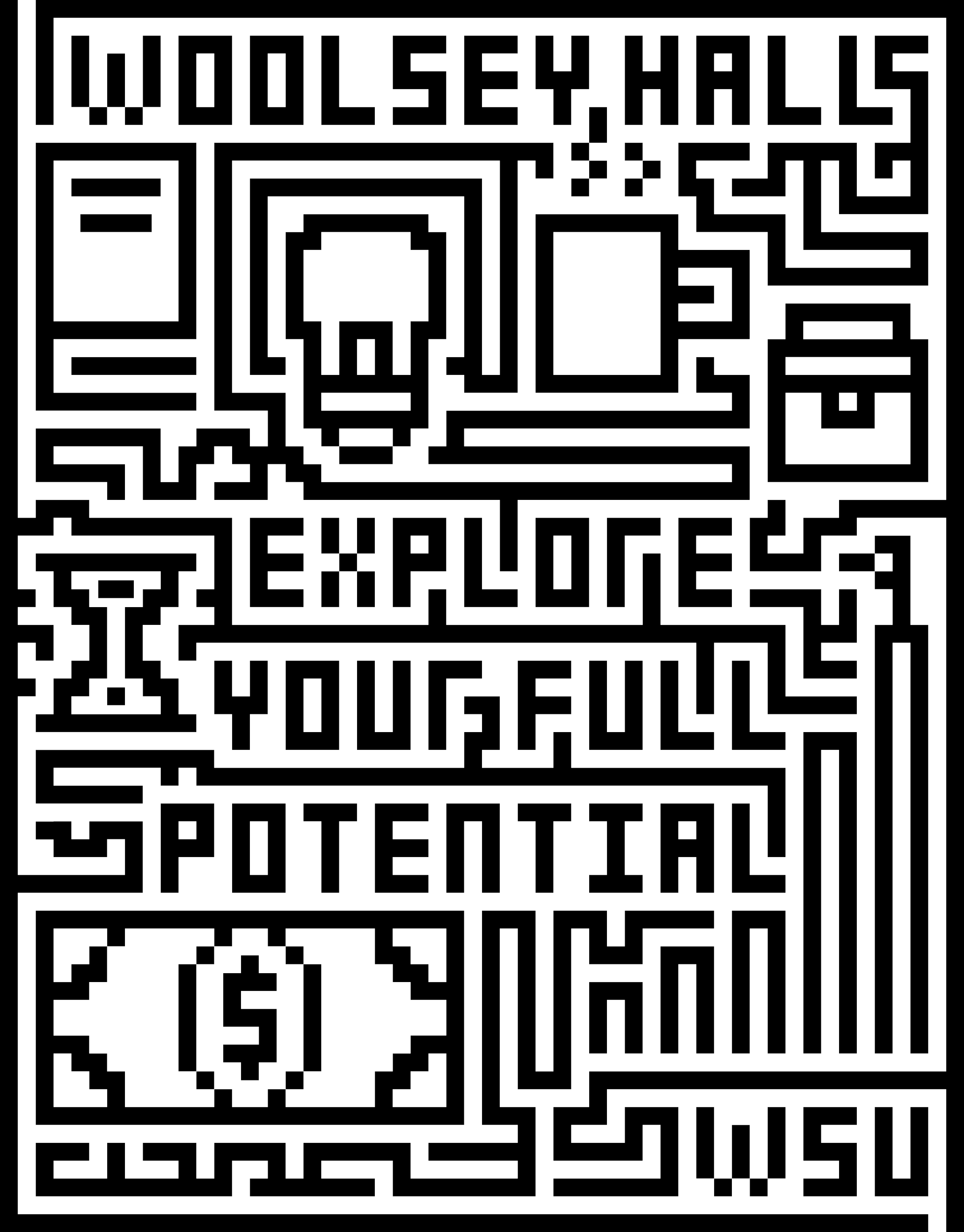 The design for Woolsey Hallβs quiet space showcases a bitmap maze including icons and words relevant to Wichita Stateβs business school. Itβs a fun and engaging way for students to interact with the spaceβor maybe even give them a brain break from whatever they are studying.